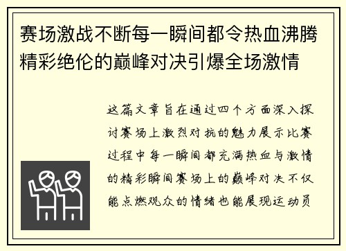 这篇文章旨在通过四个方面深入探讨赛场上激烈对抗的魅力,展示比赛过程中每一瞬间都充满热血与激情的精彩瞬间。赛场上的巅峰对决不仅能点燃观众的情绪,也能展现运动员顽强拼搏的精神。首先,文章会介绍比赛激烈对抗的历史背景和对竞技体育的重要性。接着,文...