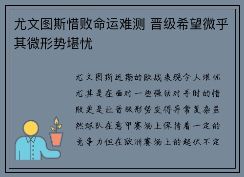 尤文图斯近期的欧战表现令人堪忧,尤其是在面对一些强劲对手时的惜败更是让晋级形势变得异常复杂。虽然球队在意甲赛场上保持着一定的竞争力,但在欧洲赛场上的起伏不定,使得他们的晋级希望看似微乎其微。在当前的情势下,尤文图斯的命运依然扑朔迷离,尽管他...