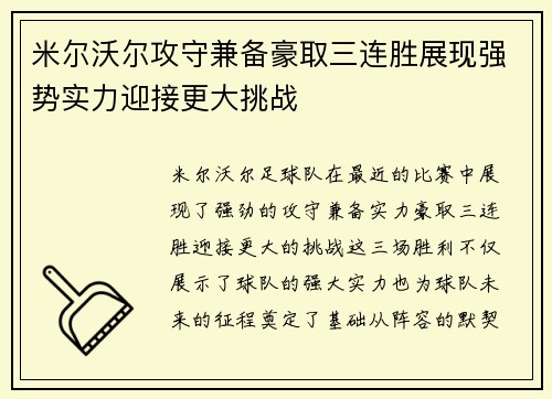 米尔沃尔攻守兼备豪取三连胜展现强势实力迎接更大挑战