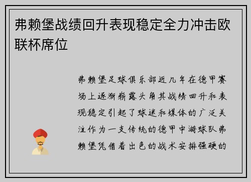 弗赖堡战绩回升表现稳定全力冲击欧联杯席位