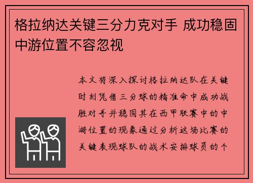 格拉纳达关键三分力克对手 成功稳固中游位置不容忽视