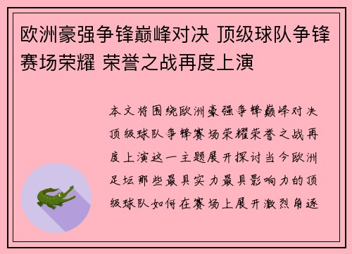欧洲豪强争锋巅峰对决 顶级球队争锋赛场荣耀 荣誉之战再度上演