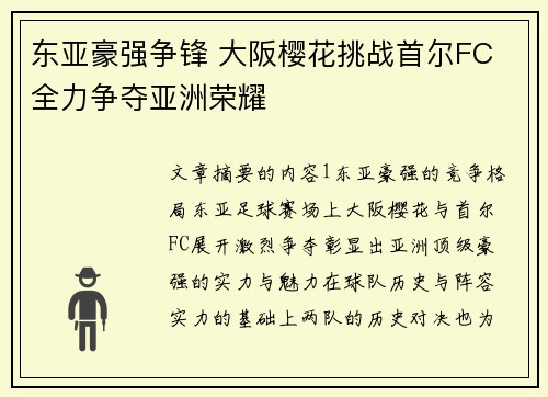 东亚豪强争锋 大阪樱花挑战首尔FC 全力争夺亚洲荣耀