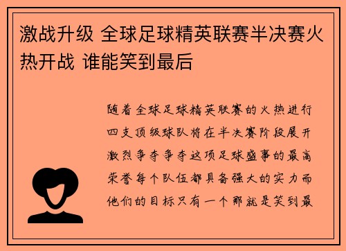激战升级 全球足球精英联赛半决赛火热开战 谁能笑到最后