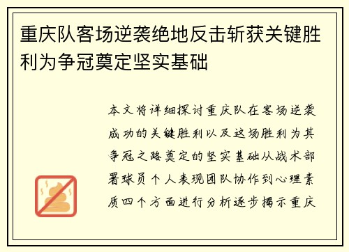 本文将详细探讨重庆队在客场逆袭成功的关键胜利,以及这场胜利为其争冠之路奠定的坚实基础。从战术部署、球员个人表现、团队协作到心理素质四个方面进行分析,逐步揭示重庆队如何在客场完成绝地反击,并通过这场关键胜利强化了争冠的信心和动力。首先,文章将...