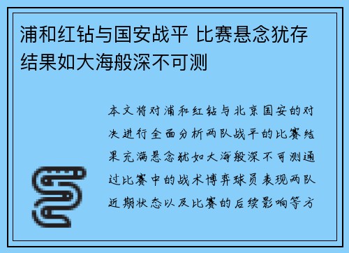本文将对浦和红钻与北京国安的对决进行全面分析,两队战平的比赛结果充满悬念,犹如大海般深不可测。通过比赛中的战术博弈、球员表现、两队近期状态以及比赛的后续影响等方面进行深入探讨。比赛的平局结果既不让任何一方完全满意,又留下了未来对决的无数可能...