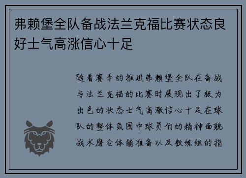 弗赖堡全队备战法兰克福比赛状态良好士气高涨信心十足