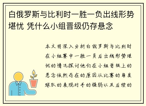 本文将深入分析白俄罗斯与比利时在小组赛中一胜一负后,出线形势堪忧的情况,探讨他们在小组晋级上的悬念依然存在的原因。从比赛的角度、球队的表现、对手的强弱以及后续的赛事安排四个方面进行详细剖析。首先,我们将讨论两队的比赛成绩及形势,并分析各自的...
