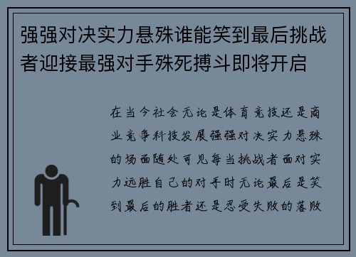 强强对决实力悬殊谁能笑到最后挑战者迎接最强对手殊死搏斗即将开启
