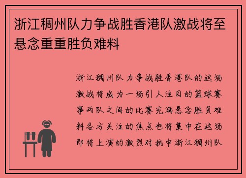 浙江稠州队力争战胜香港队激战将至悬念重重胜负难料