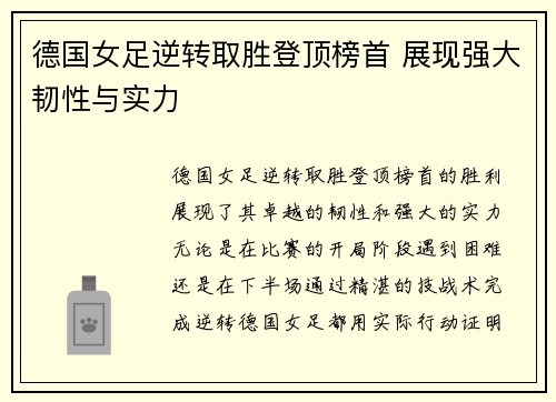 德国女足逆转取胜登顶榜首 展现强大韧性与实力