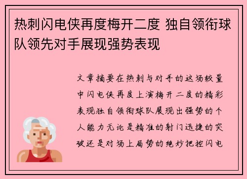 热刺闪电侠再度梅开二度 独自领衔球队领先对手展现强势表现