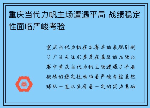 重庆当代力帆主场遭遇平局 战绩稳定性面临严峻考验