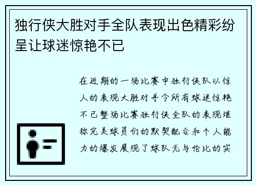 独行侠大胜对手全队表现出色精彩纷呈让球迷惊艳不已